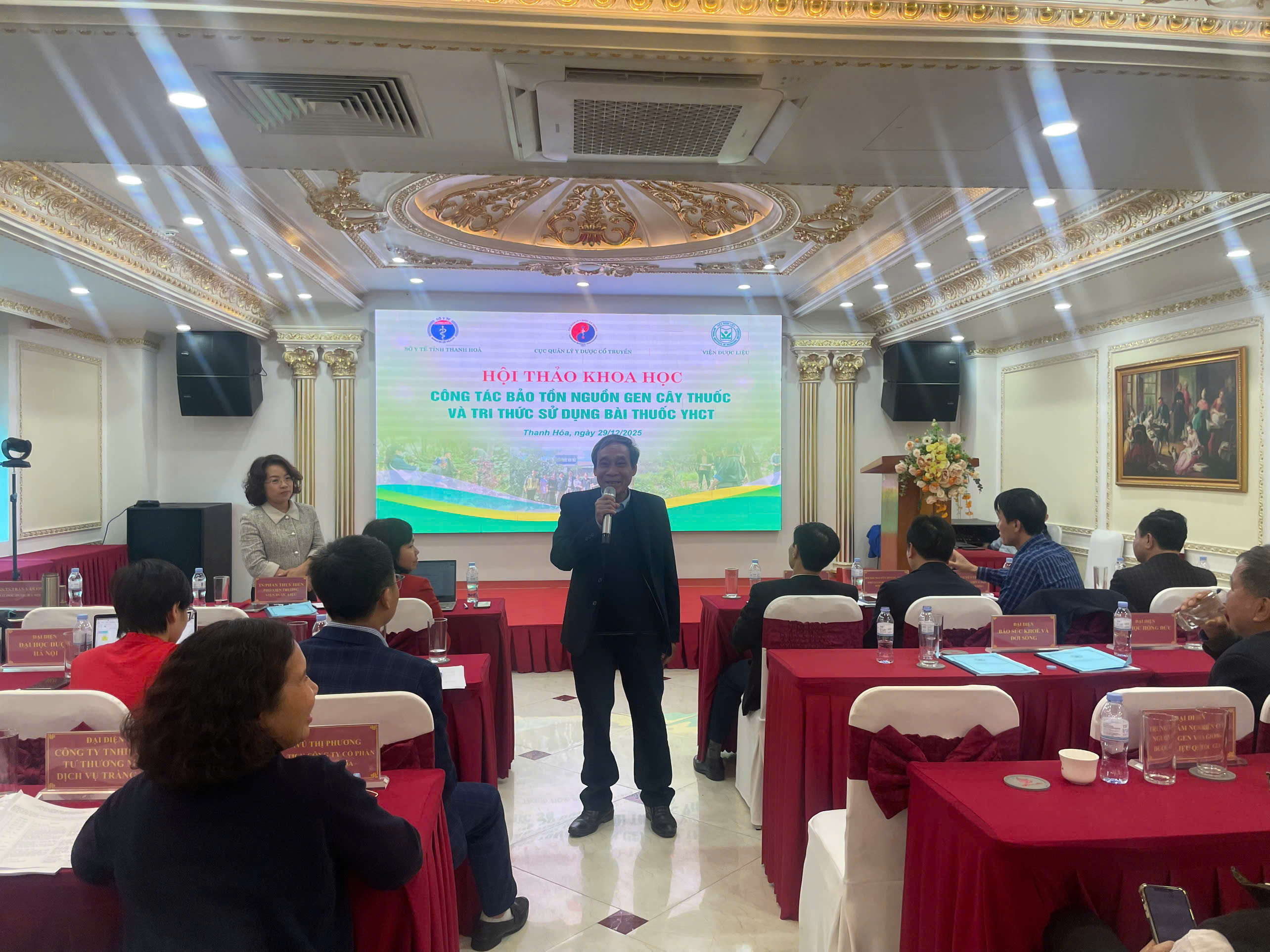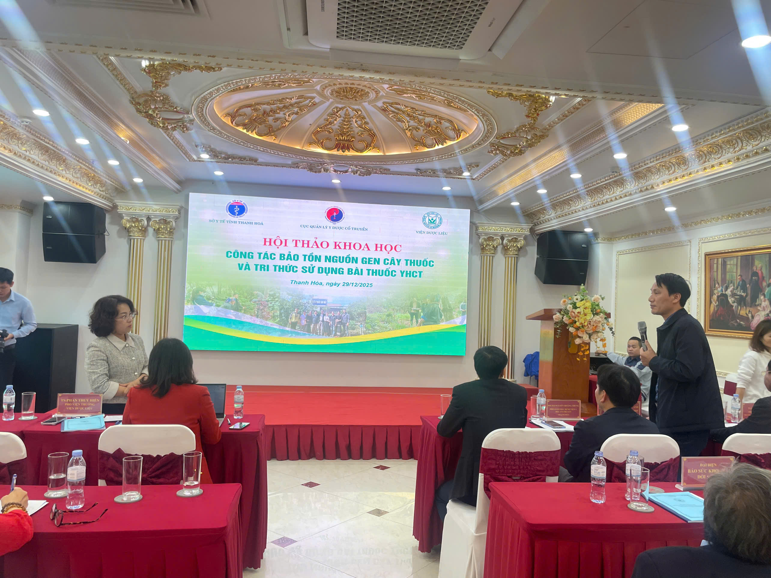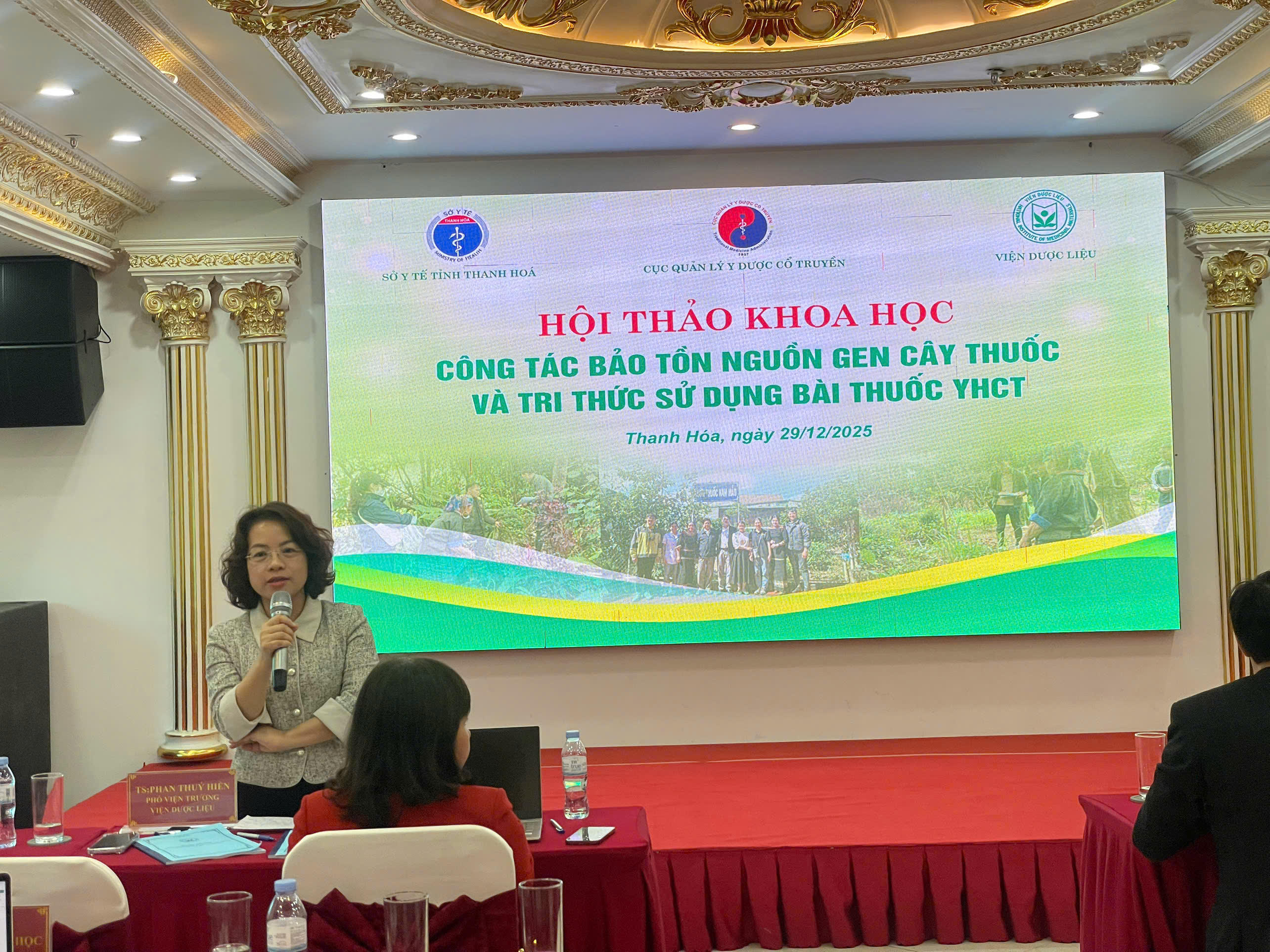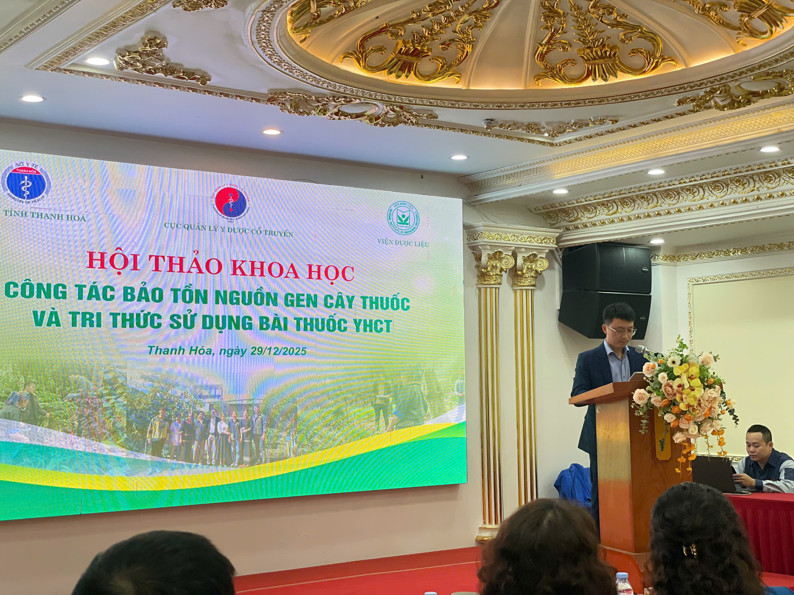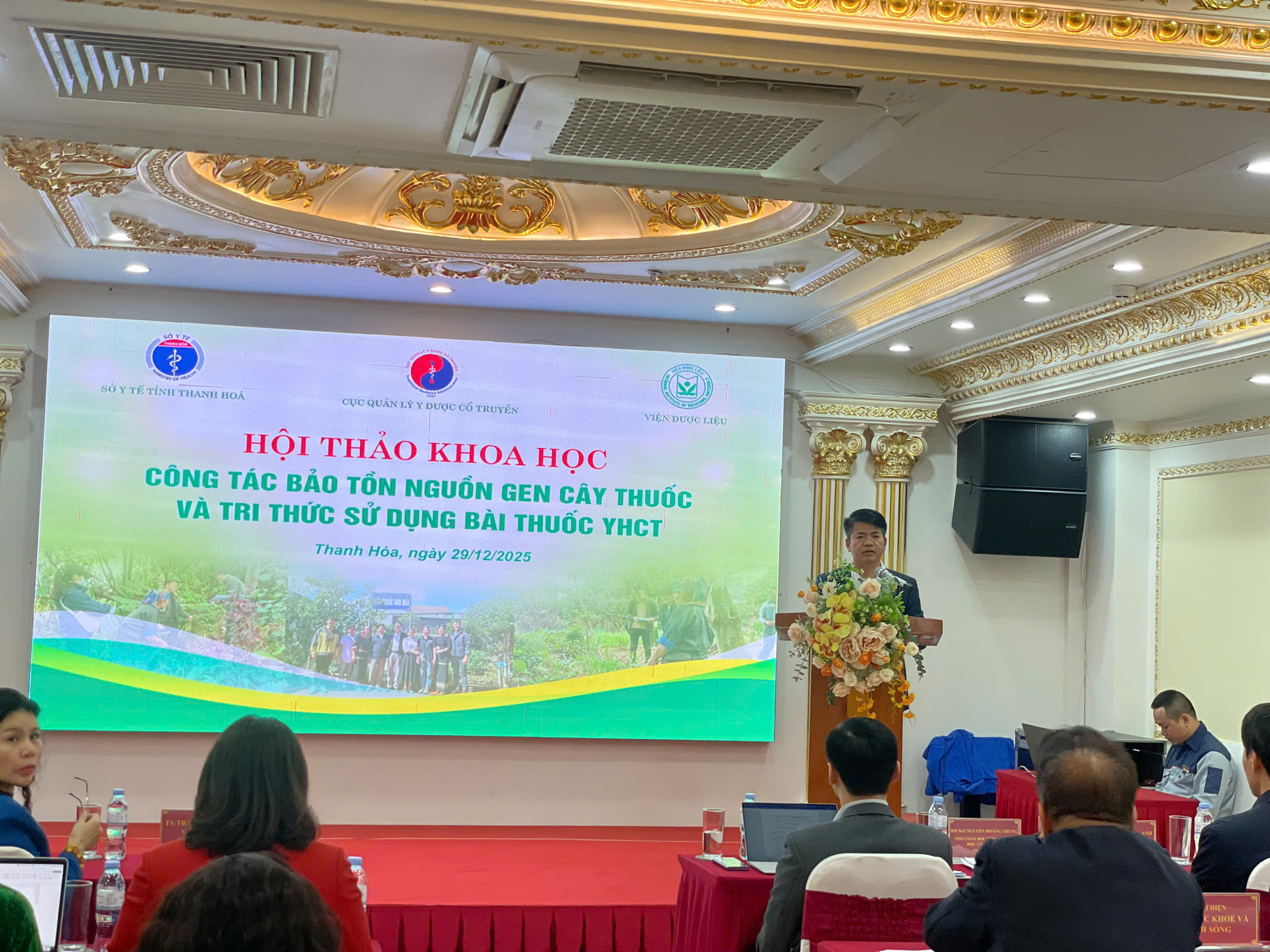 Ngày 29/12/2025, tại thành phố Thanh Hóa, Viện Dược liệu kết hợp với Cục Quản lý Y, Dược cổ truyền và Sở Y tế Thanh Hóa đã tổ chức thành công Hội thảo khoa học với chủ đề “Công tác bảo tồn nguồn gen cây thuốc và tri thức sử dụng bài thuốc Y học cổ truyền” theo hình thức trực tiếp và trực tuyến. Hội thảo có TS. Trần Minh Ngọc - Viện trưởng và TS. Phan Thúy Hiền – Phó Viện trưởng Viện Dược liệu đại diện đơn vị chủ trì; đồng chí Lê Anh Hiếu – Phó Giám đốc đại diện Sở Y tế tỉnh Thanh Hóa; đại diện Lãnh đạo các cơ quan quản lý và địa phương: Cục Quản lý Y, Dược cổ truyền, Văn phòng UBND thành phố Hải Phòng, Bệnh viện Y học cổ truyền Hải Dương, Bệnh viện Y dược cổ truyền tỉnh Thanh Hóa, Học viện Y – Dược học cổ truyền Việt Nam, Trường Đại học Dược Hà Nội, Trường Cao đẳng Nông Lâm Thanh Hóa; Viện Nông nghiệp Thanh Hóa và Trường Đại học Hồng Đức, Đại diện Hội Giống cây trồng tỉnh Thanh Hóa, Hội Đông y tỉnh Thanh Hóa; Đại diện các đơn vị truyền thông và doanh nghiệp và đông đảo các nhà khoa học…