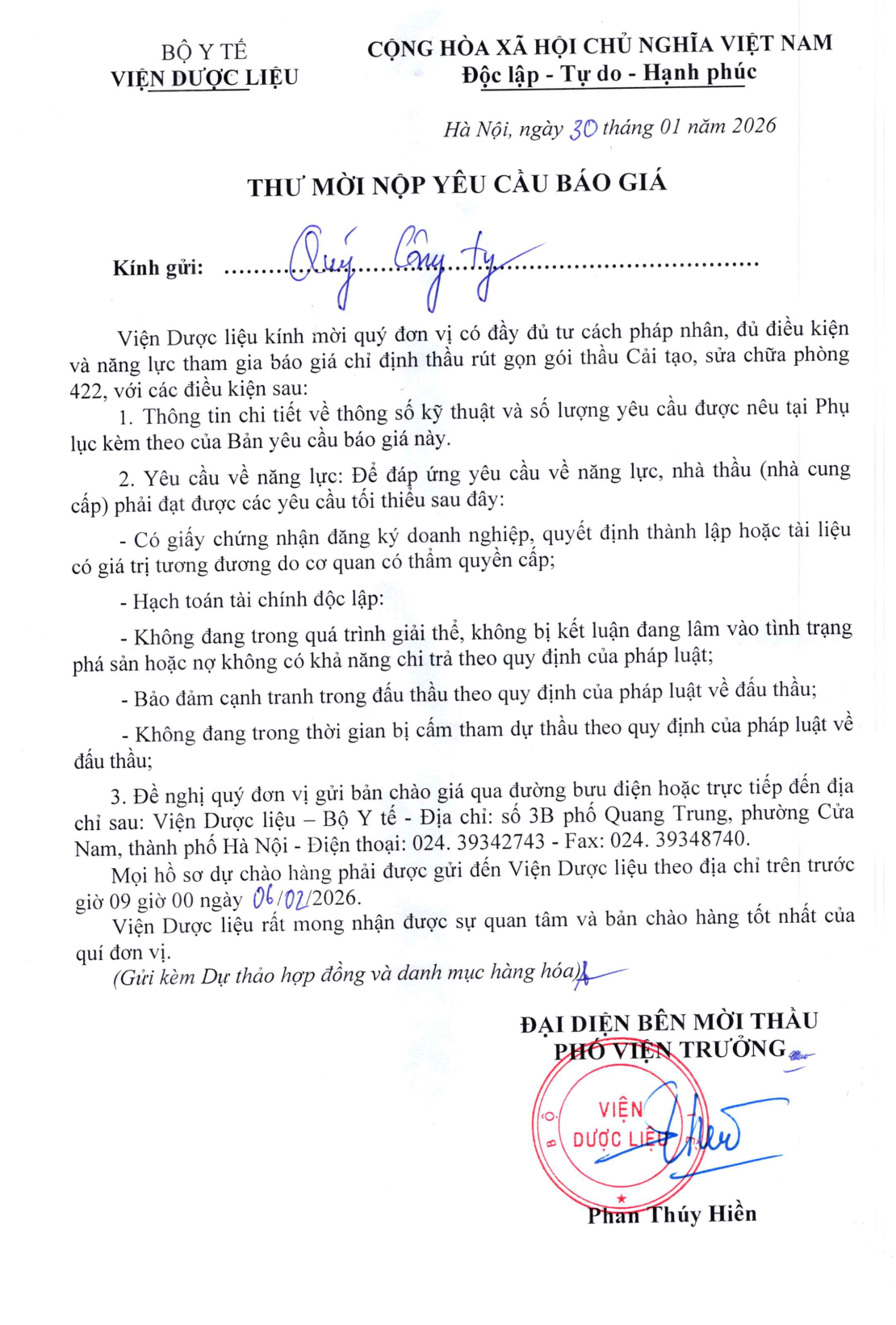 Thư mời nộp yêu cầu báo giá