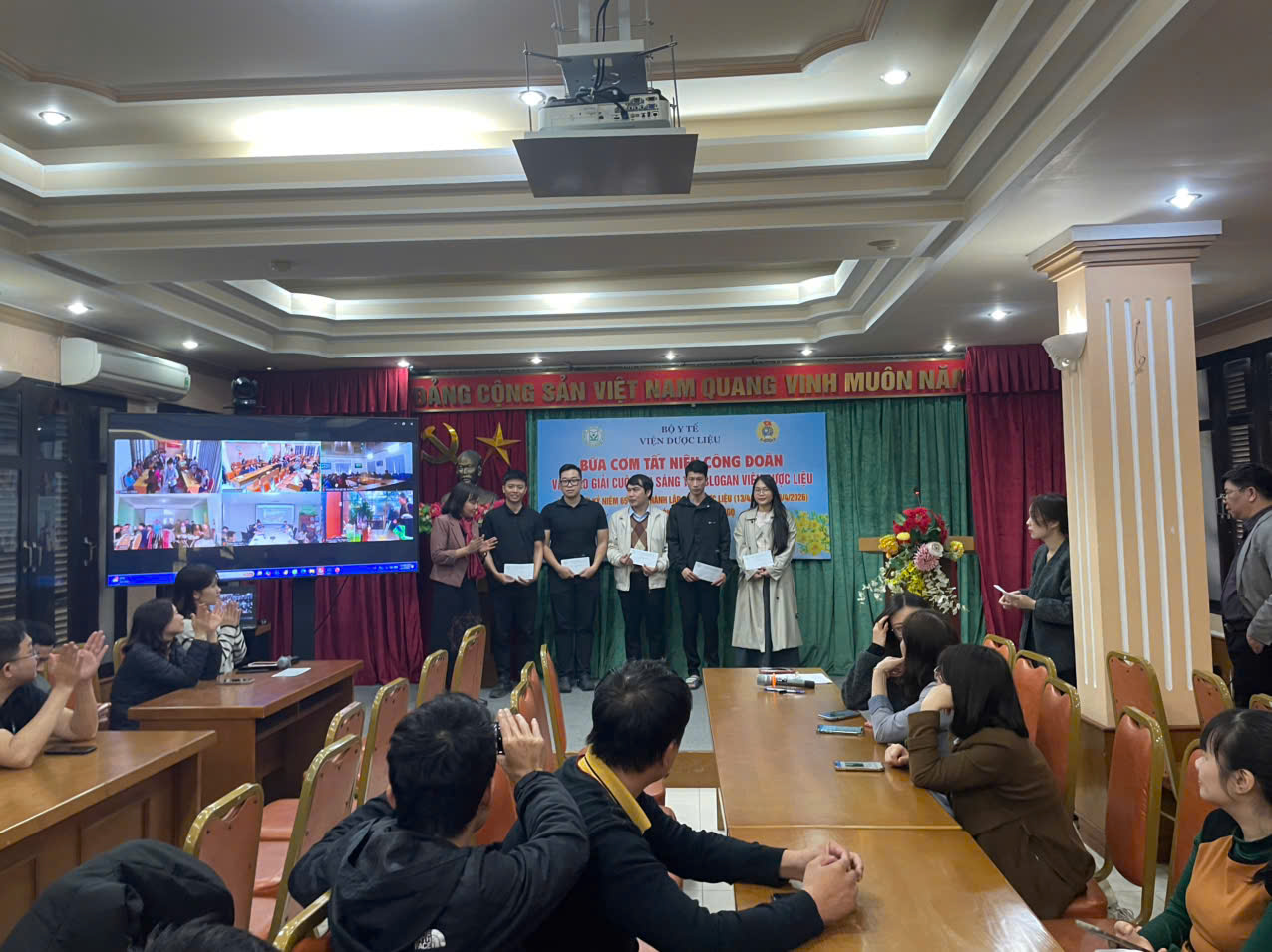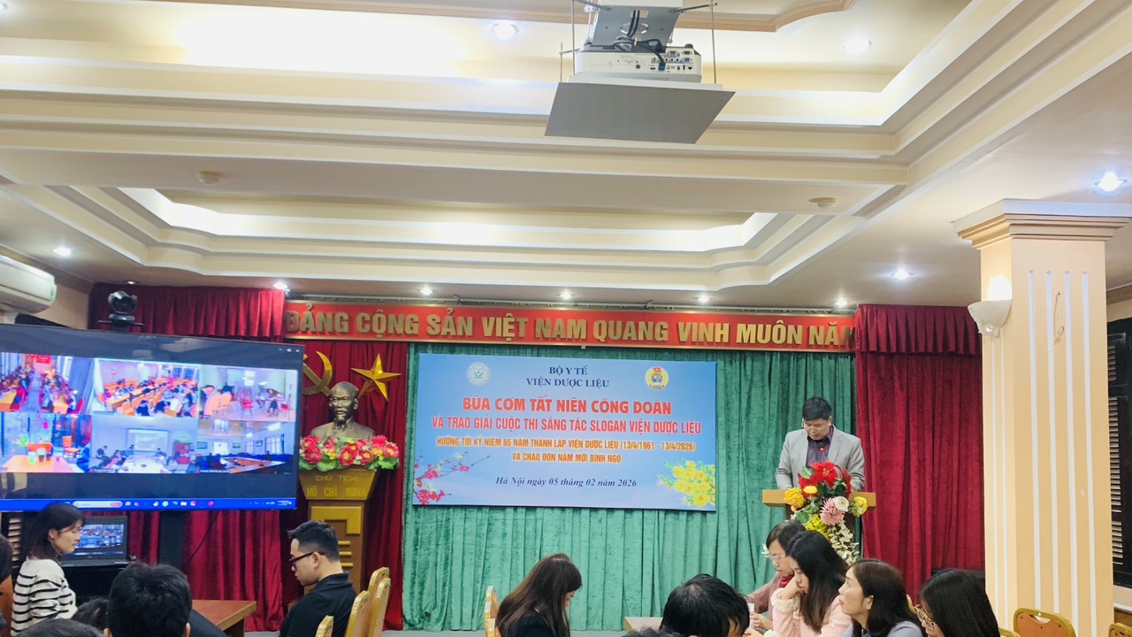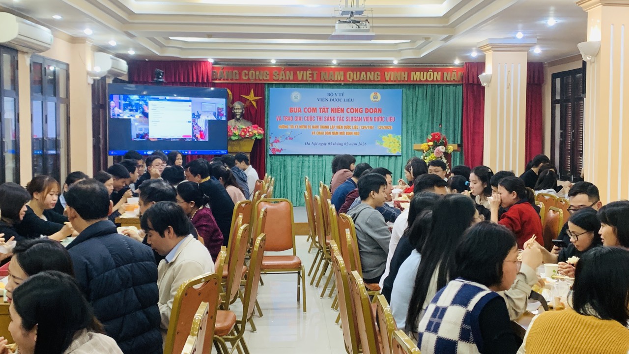 Trong không khí rộn ràng, tươi vui những ngày cận Tết Bính Ngọ 2026, trưa ngày 05/02/2026, Công đoàn cơ sở Viện Dược liệu đã tổ chức Bữa cơm Tất niên công đoàn và trao tặng quà Tết của Công đoàn Y tế Việt Nam tới các đồng chí đoàn viên trong Viện. Bữa cơm được tổ chức theo hình thức trực tiếp tại Viện và trực tuyến với 7 điểm cầu là các Trung tâm ở xa (Trung tâm Nghiên cứu Dược liệu Tây Nguyên, Trung tâm Nghiên cứu Dược liệu Bắc Trung Bộ, Trung tâm Nghiên cứu Dược liệu Sa Pa, Trung tâm Nghiên cứu Dược liệu Tam Đảo, Trung tâm Nghiên cứu trồng và chế biến cây thuốc Hà Nội, Trung tâm Ứng dụng Khoa học Công nghệ Dược liệu, Trung tâm Nghiên cứu nguồn gen và giống dược liệu quốc gia). Đây là các hoạt động nằm trong chuỗi chương trình do Công đoàn Y tế Việt Nam triển khai nhằm hỗ trợ chăm lo Tết 2026 cho người lao động như “Chợ Tết Công đoàn”, “Bữa cơm tất niên” và “Trao tặng quà Tết” đầy ý nghĩa.